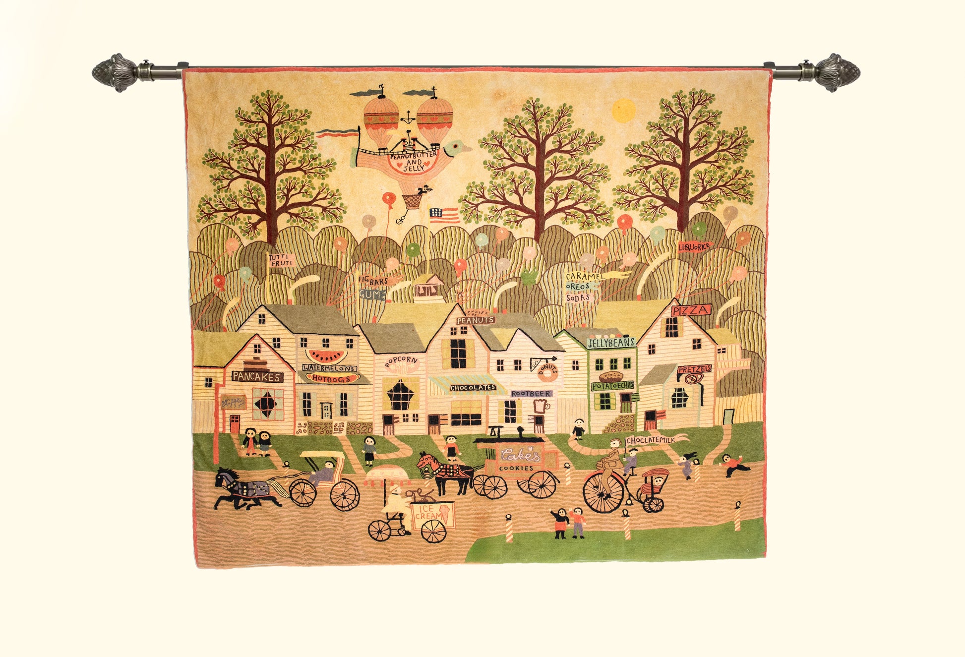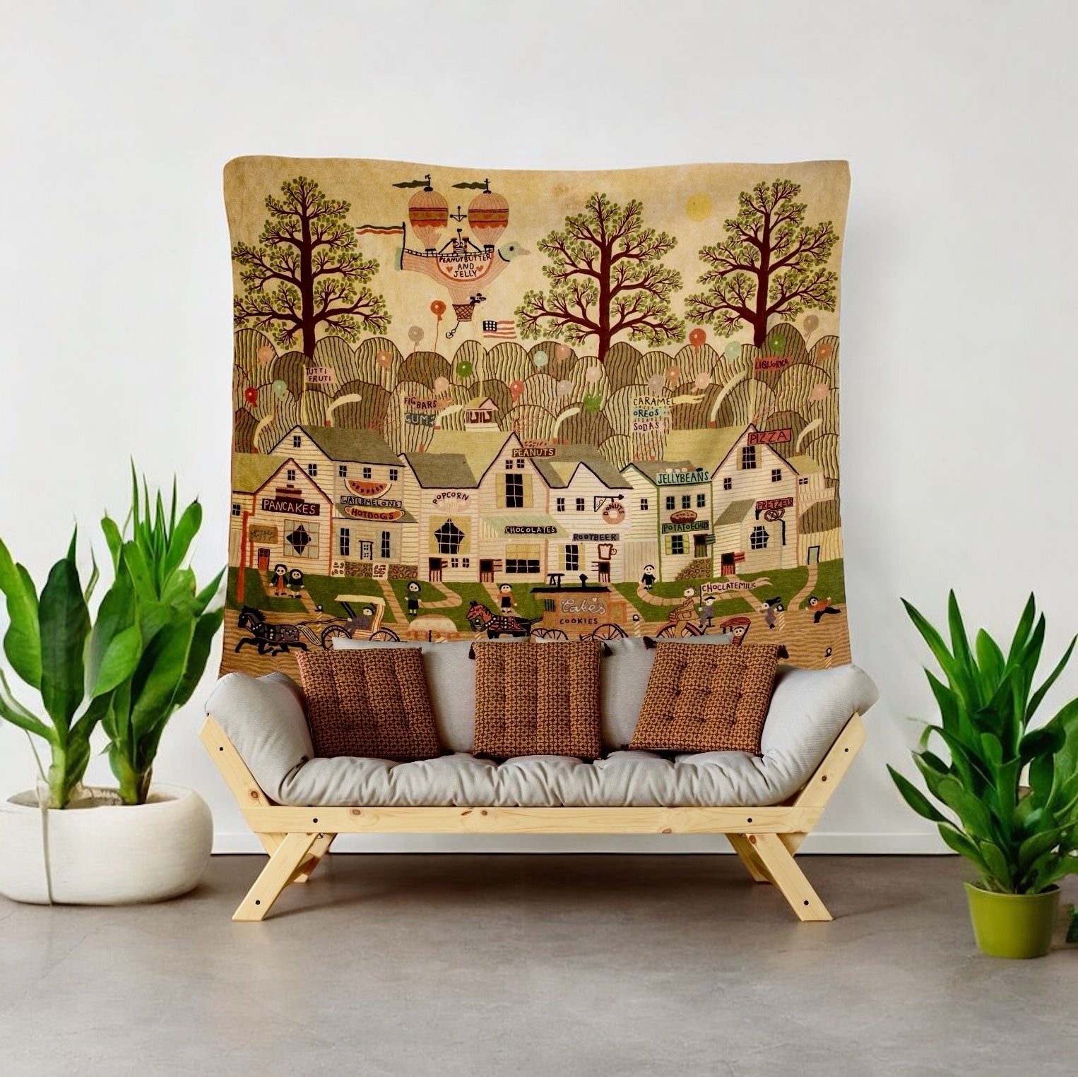 Step into a charming slice of America with our "American Delights" tapestry, a vibrant portrayal of a traditional town bustling with small shops and iconic pop culture references.