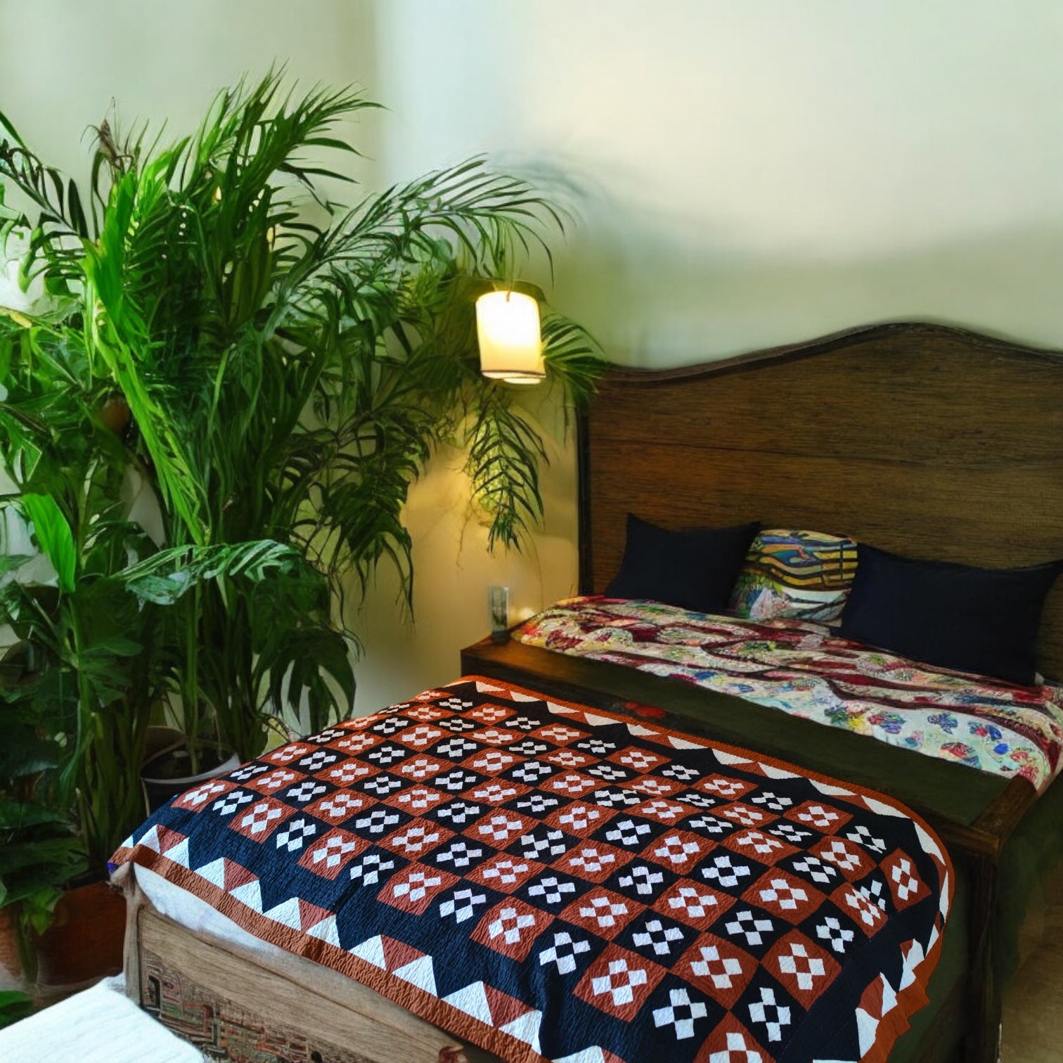 The Cyra Throw boasts an exquisite design, featuring mesmerizing white diamond and triangle patterns that evoke the spirit of a bygone era. These intricate motifs are thoughtfully arranged to create a visual masterpiece, capturing the essence of vintage craftsmanship. The bold black inner border adds a striking contrast, elevating the overall aesthetic of your sleeping sanctuary.