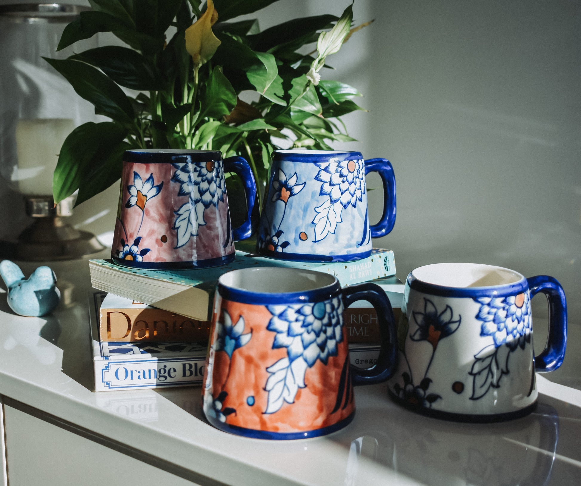 Description: These exquisite hand-painted mugs bring warmth and artistry to every sip. Crafted with care, each piece features intricate floral patterns in vibrant hues of deep blue, fiery orange, and soft blush, evoking the beauty of blooming gardens. The designs, brimming with rustic charm, blend traditional craftsmanship with a modern aesthetic, making them perfect for cozy tea times or thoughtful gifting. Every brushstroke on these mugs whispers a story of love, creativity, and the timeless allure of handmade artistry.