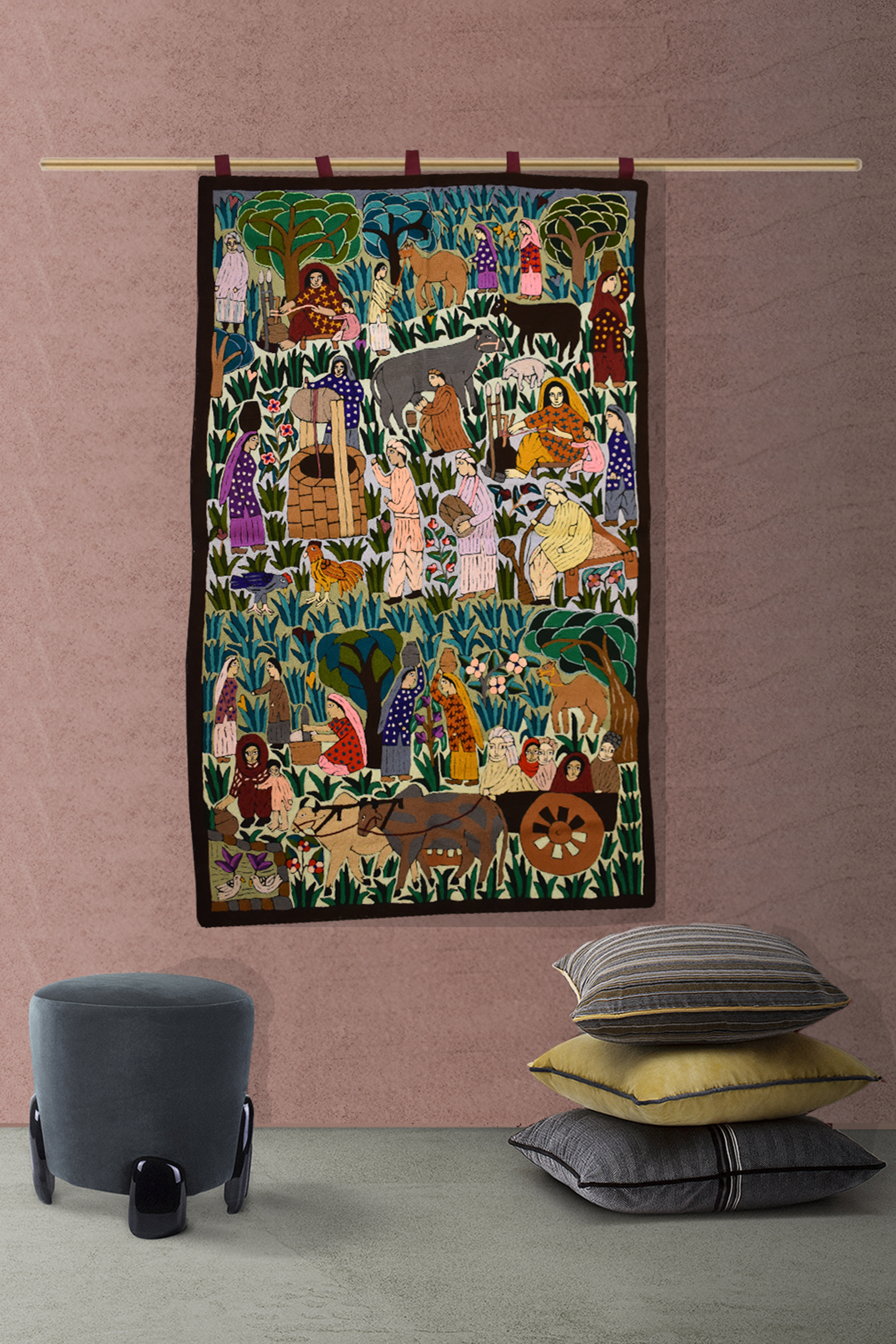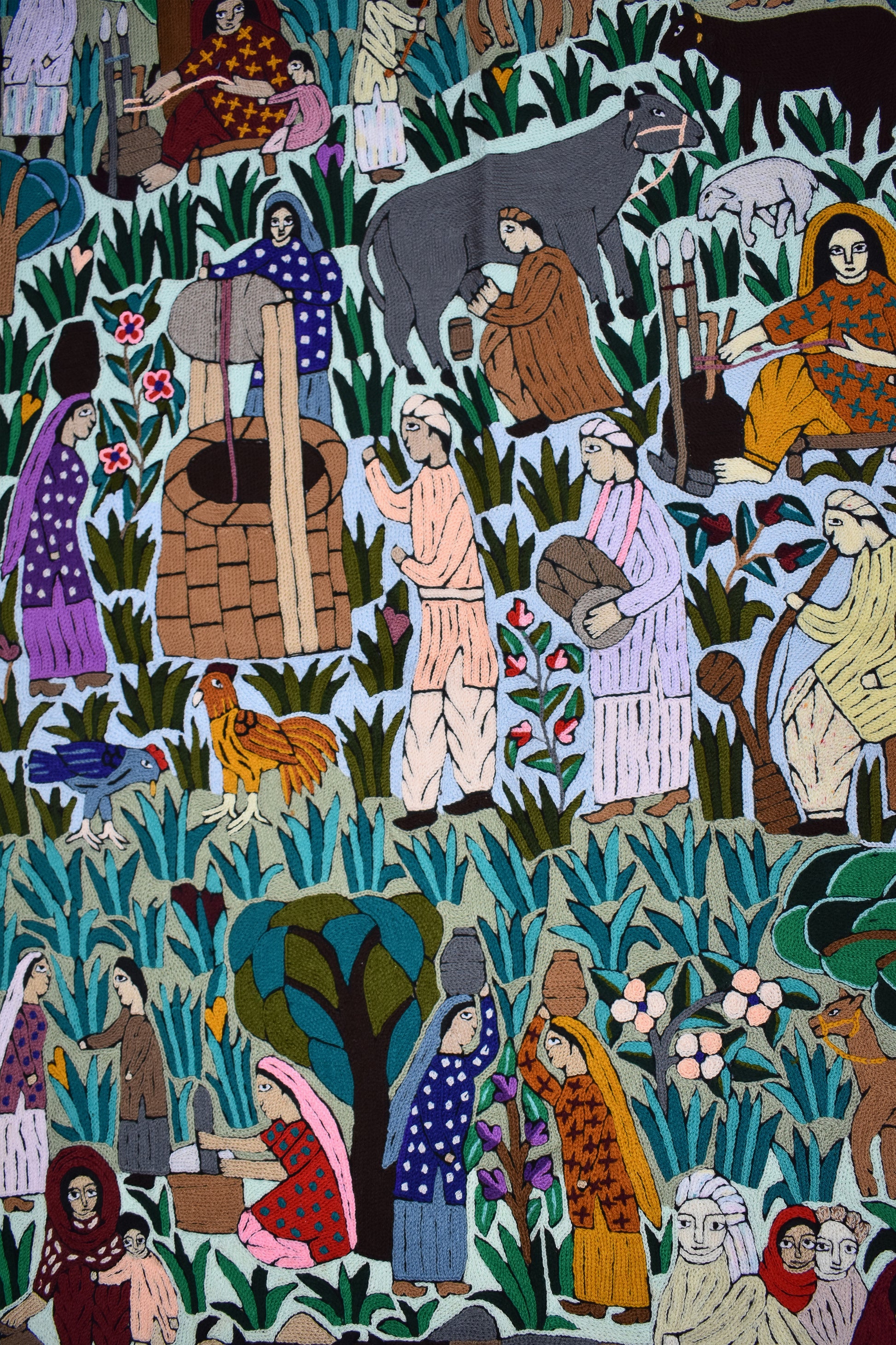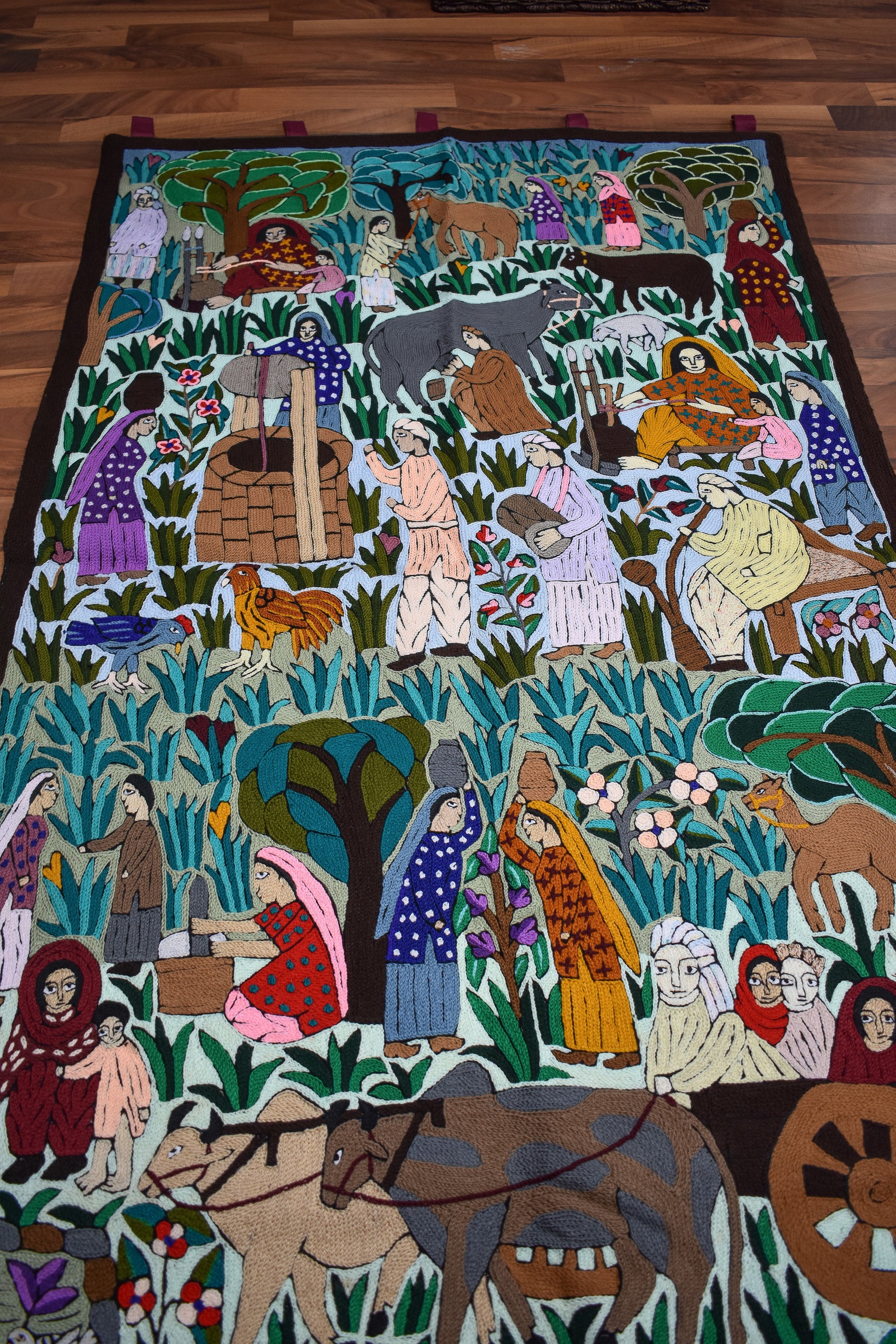The Gabba is made by local women of Pakistan who produce these beautiful pieces with so much love and time. However, due to cultural restrictions, they are not allowed to go out and do this in public settings therefore, they work from home. It takes months to complete one Gabba as it is handmade. The women tell their stories and lifestyle through these Gabbas. The woman in purple shalwar kameez and dupatta is the maker of this particular Gabba.