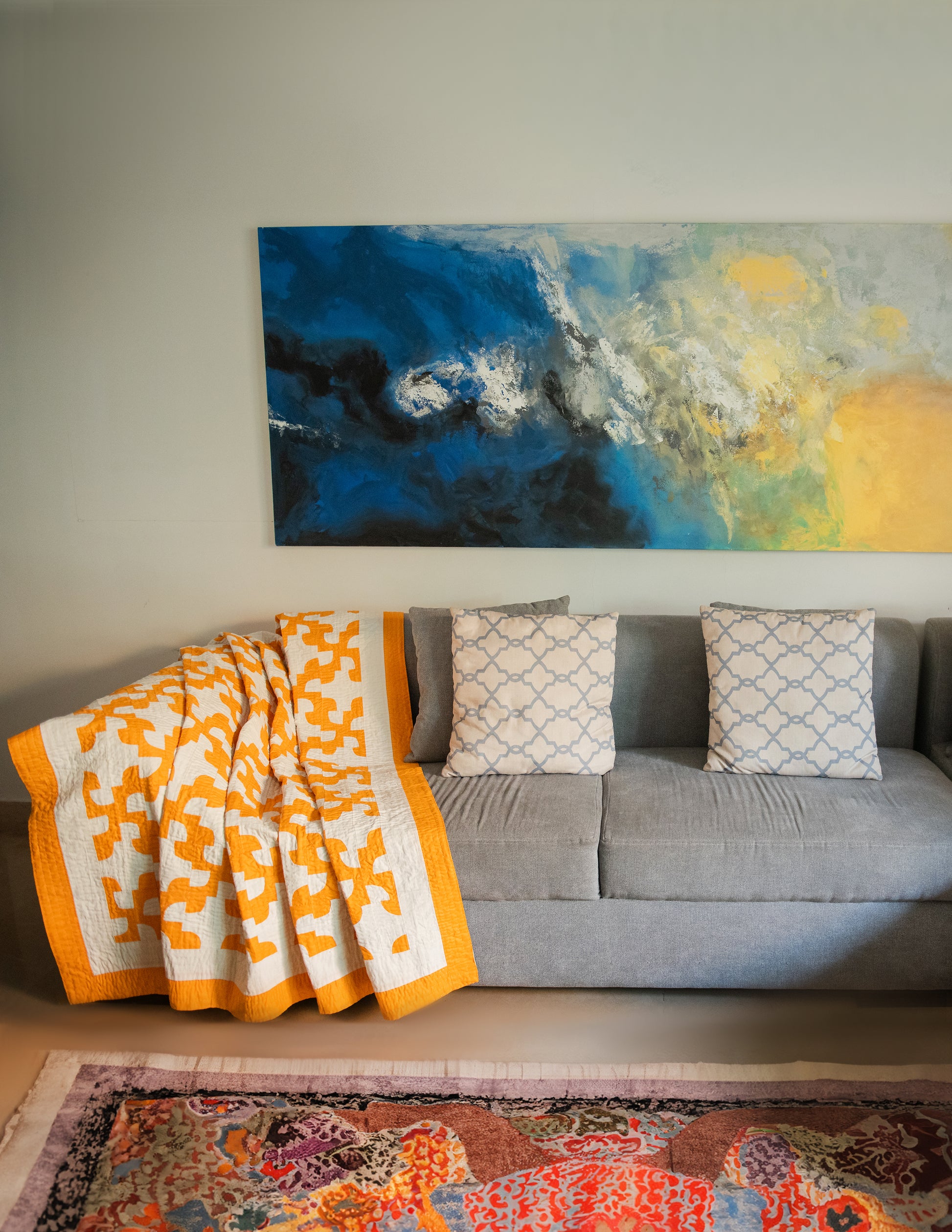The mustard border frames the ralli with a touch of sophistication, adding to its timeless appeal. Whether draped over a couch, adorning a bed, or displayed as a wall hanging, this vintage ralli promises to infuse your space with the charm and elegance of Sindh craftsmanship. Embrace the allure of heritage and add a piece of timeless beauty to your home with our Mustard Ralli.