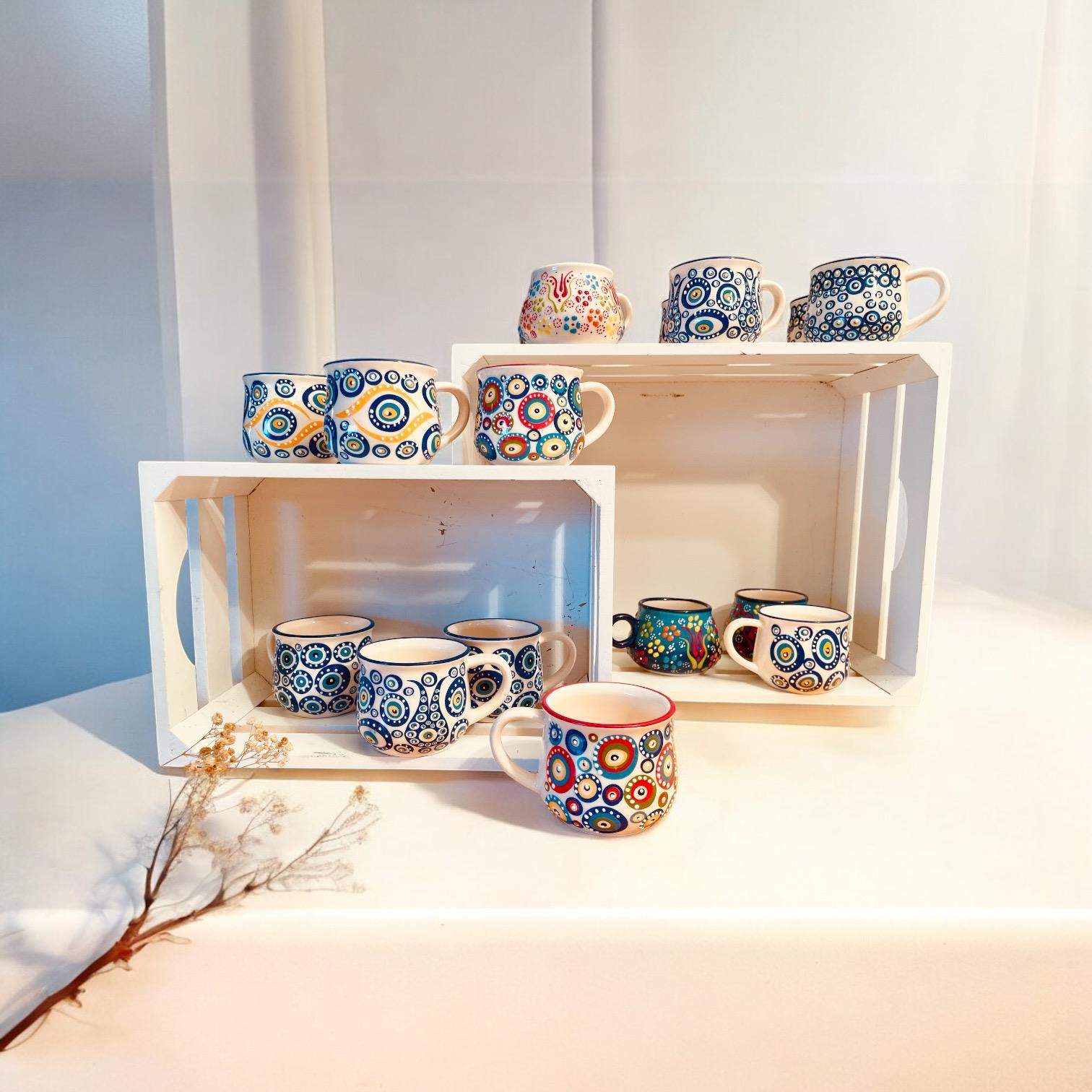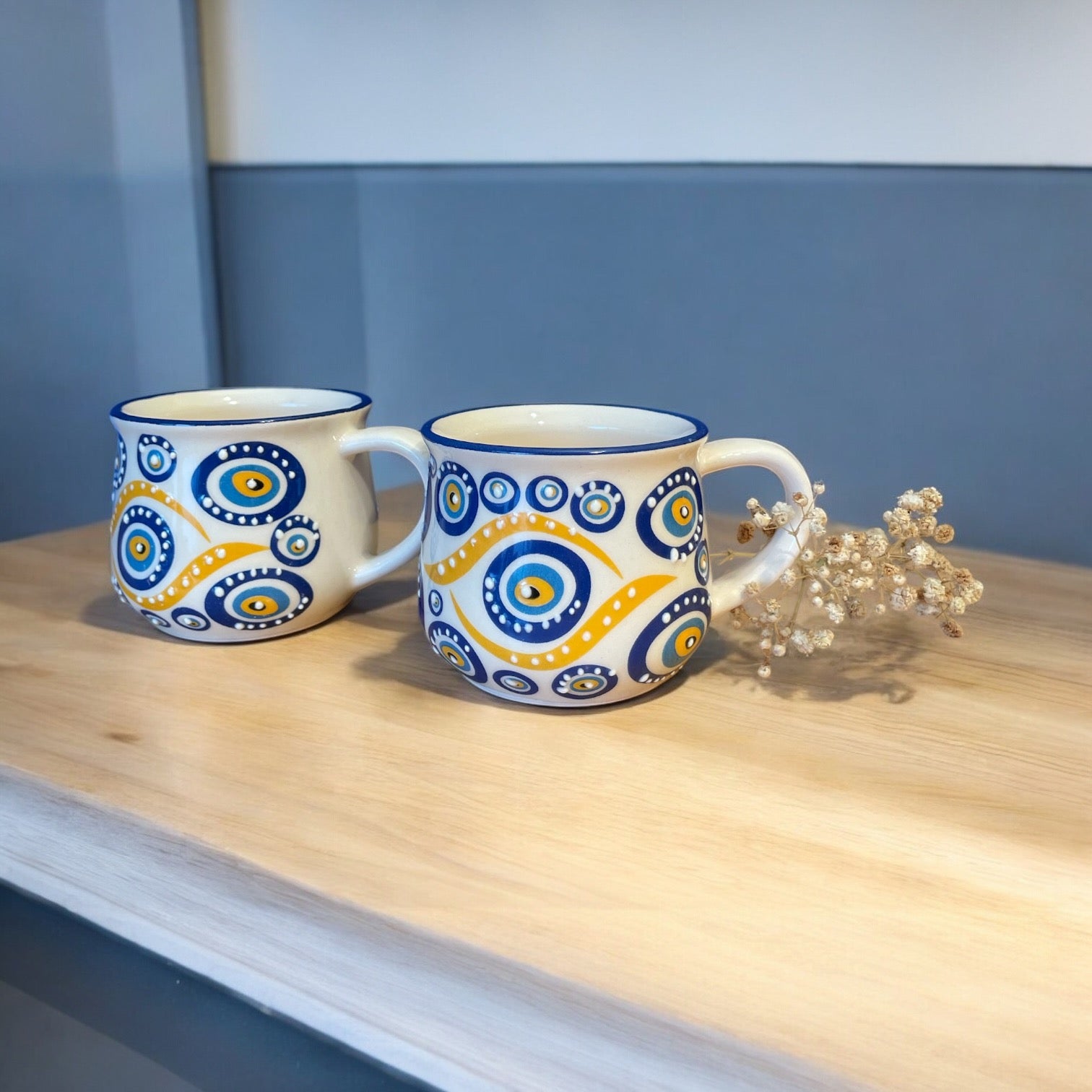 “Ocean Eye” pair of mugs the blue and circular patterns resemble the look of waves and calming ocean colors mixed with eye-like shapes, giving them protective and scene vibe. Sustainable hand painted and perfect gift for Christmas.