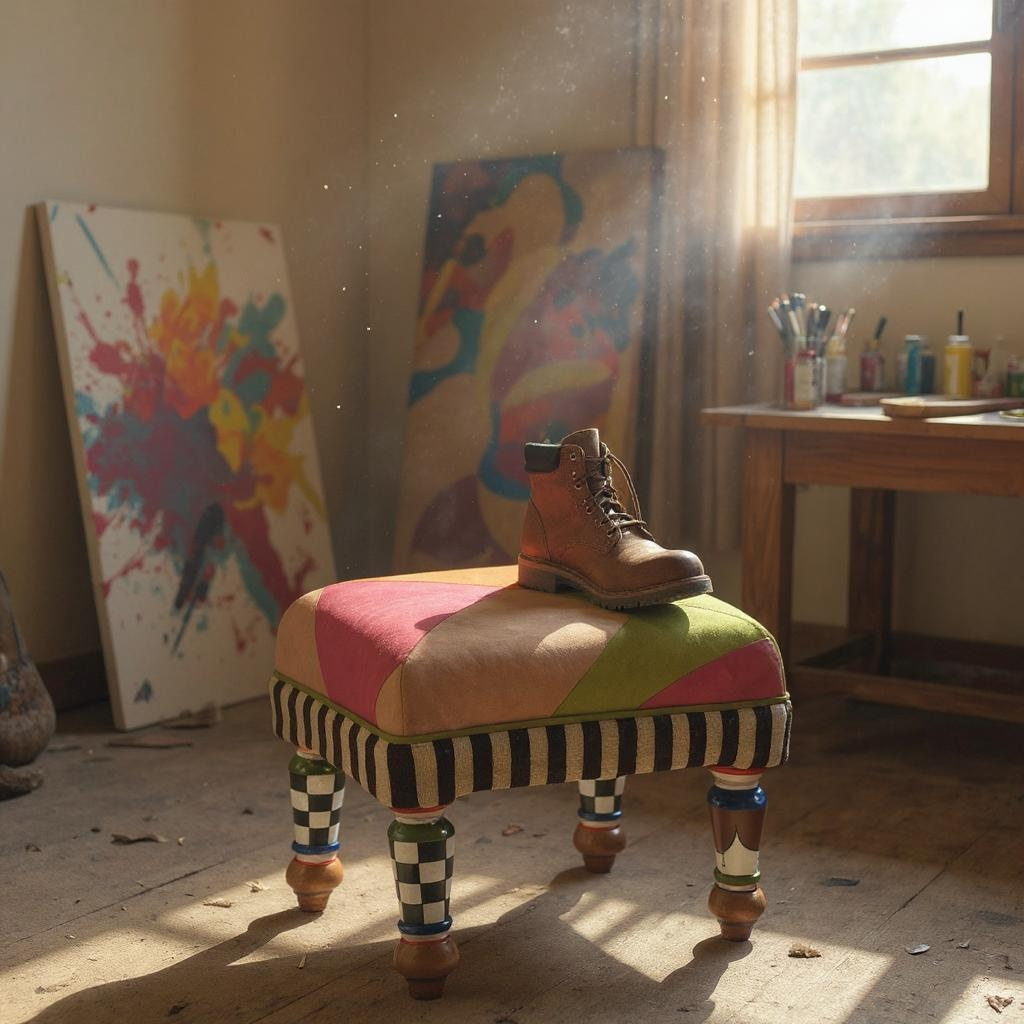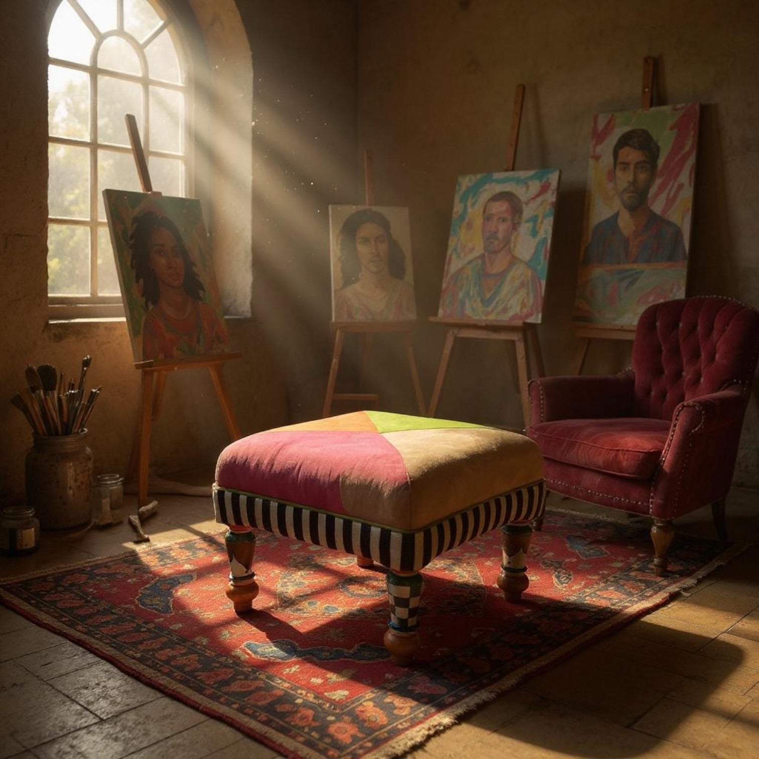 Let your space speak in color and character with our “Painter’s Muse” footstool a tribute to creativity, comfort, and craftsmanship. Designed to stand out, this one-of-a-kind piece features a velvet-soft patchwork seat in bold, contemporary tones: raspberry pink, citrus orange, olive green, and soft sand. The striped base adds a hint of old-world charm, while the hand-painted wooden legs, inspired by whimsical art studios and theatrical design, make it a true conversation starter.