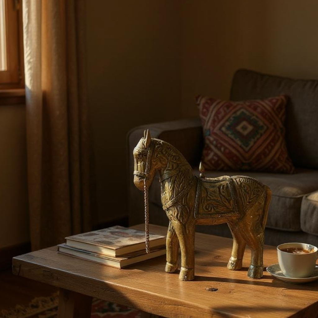 An elegant blend of tradition and craftsmanship, this vintage brass horse sculpture features a hand-carved wooden core encased in detailed brass work. With its antique gold finish and symbolic design, it adds character and cultural depth to any living space. Perfect for shelves, coffee tables, or as a statement piece.